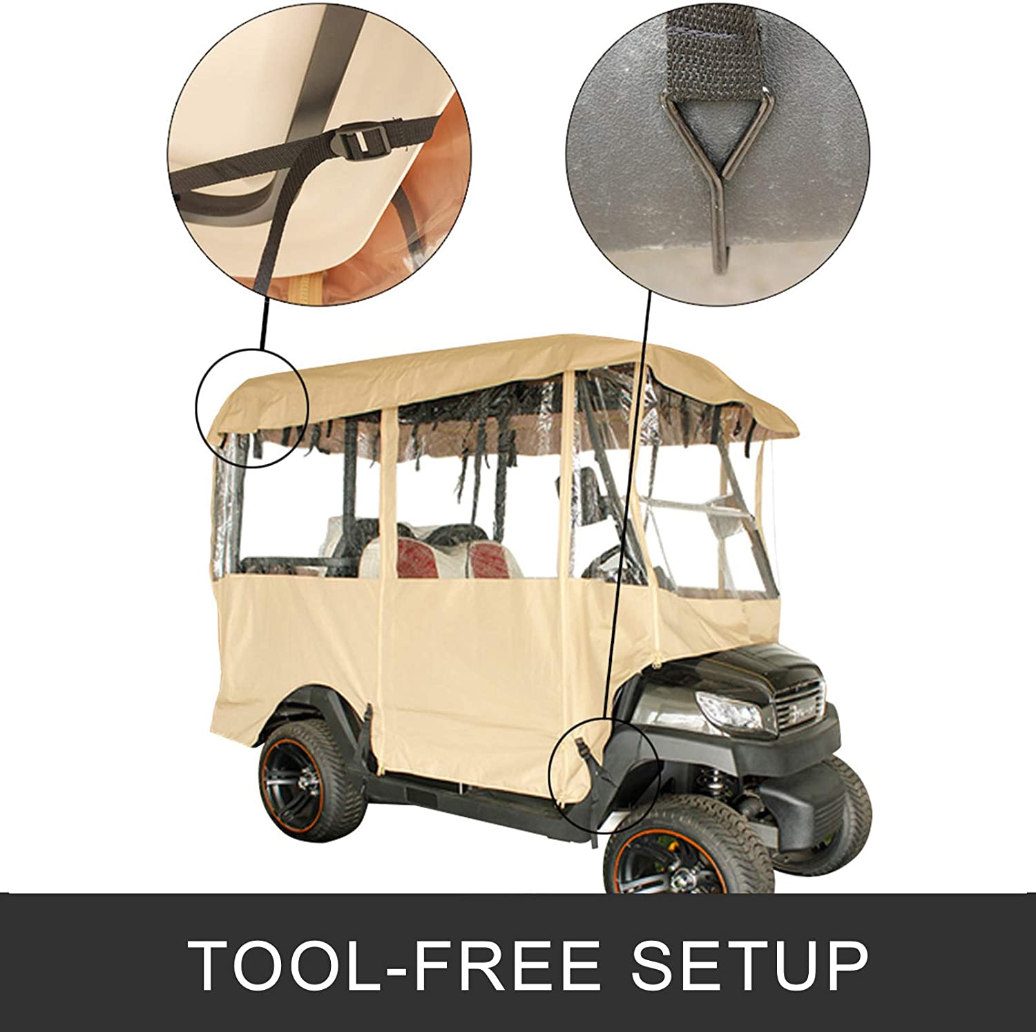 PREMIUM MATERIAL: Constructed of 300D Oxford cloth with PVC coating, PVC window, and #10 Resin Zipper, it is durable, water-resistant, ultraviolet-proof, against wind and rain. Can keep the cart inside dry and clean, keep people inside warm. Let you enjoy golf with no worry.
