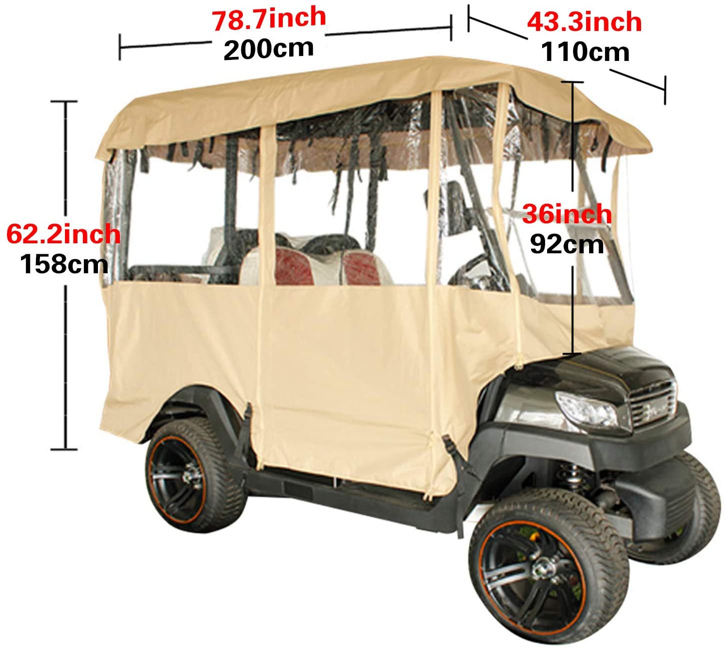 FITS 4 PEOPLE: Designed for most 4-seat golf carts. As long as you golf cart is 200cm/78.7in in length, 110cm/43.3in in width, 150-165cm/59-65in in height. This adjustable driving enclosure is made for you.