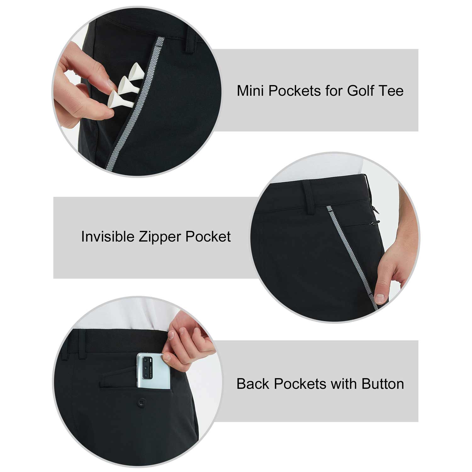 Professional Golf Shorts: The golf shorts have 2 slant pockets on each side and 2 back pockets, 1 hidden pocket, 1 golf tee hold pocket. Multiple pockets allow you to carry more item during golfing.