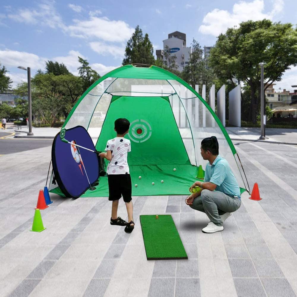 Wide-opened tent, 9.8ft W x 6.6ft H x 6ft D/ 6.6ft W x 4.6ft H x 3.3ft D, collects all hitting balls onto the golf net. Catch and ball return design stops the balls at the base of the net for easy clean up.