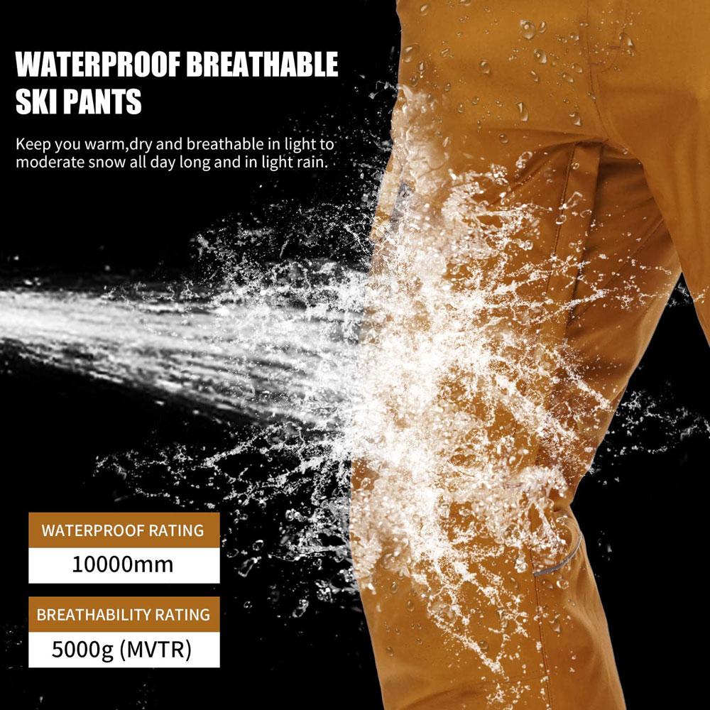 Wind and Water Resistant Outer Shell: This snow pants' 10000mm/H2O waterproof index finish increases wet-weather protection by stopping saturated snow and slight rain. Using a stretchy polyester honeycomb shell hold up well against tears and abrasion and moisture wicking(MVTR 5000), keeping cool and dry wearing experience.