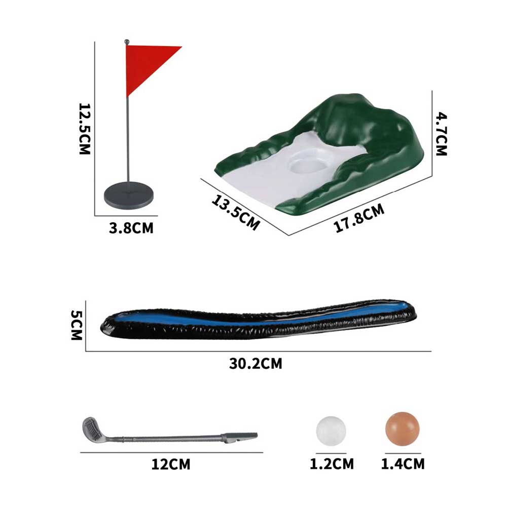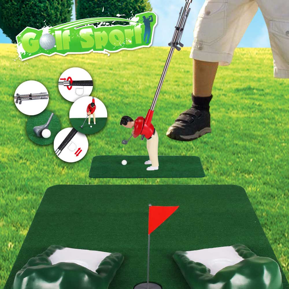 The mini golfing man indoor golf game comes with everything you'll need to get an extra-competitive game of indoor golf going, including two mini man shot makers attached to long poles to make it seem like you're really about to golf, Includes 12 clubs. One of them is left hand, a putting green, a tee box, 2 sand traps, 1 water hazard, 24 mini driving balls, a pin, and a cup.
