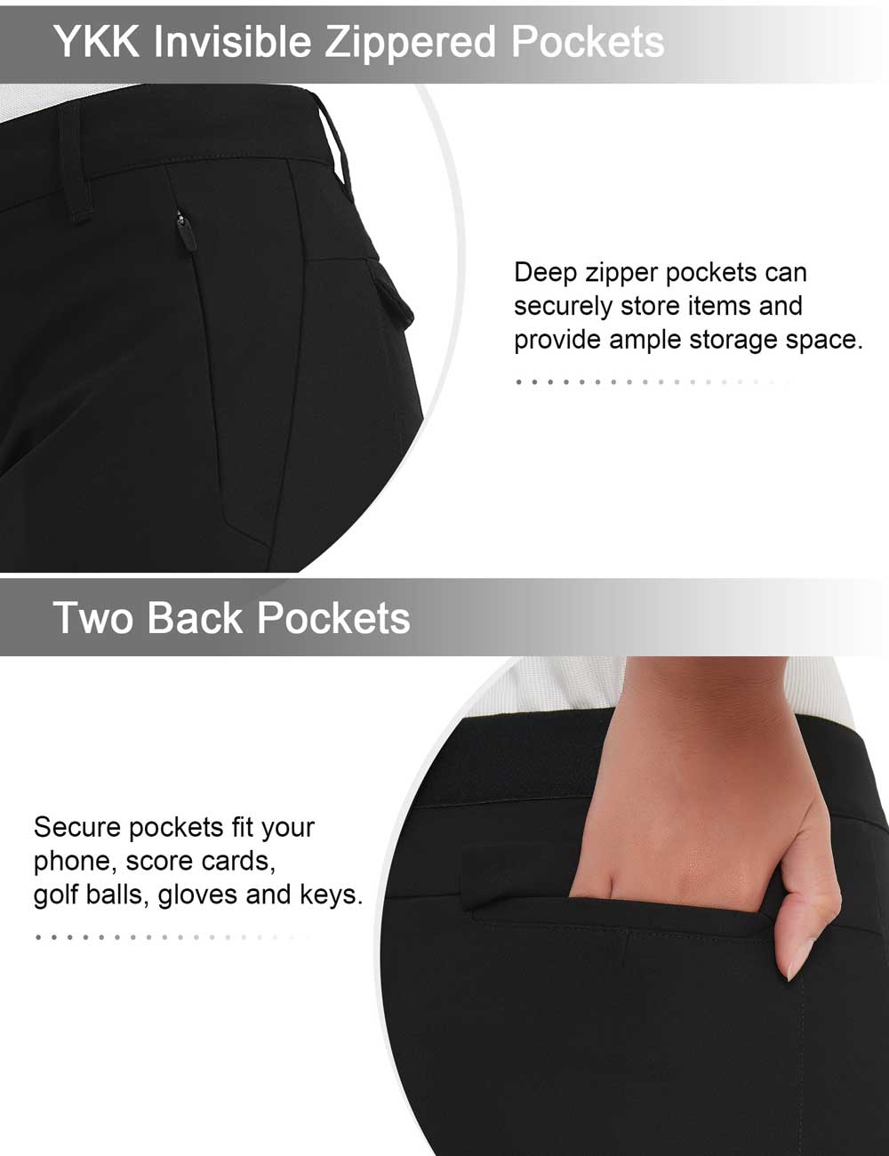 4 Pockets & D-ring: These golf pants women are designed with convenience in mind, featuring hidden zippered pockets on both sides and two additional pockets at the back for securely storing valuable items such as phones, cards, or keys. Rubberized zipper pulls add a sporty touch, and there is a D-ring on the waist for easy carrying of keys and gloves, among other items.