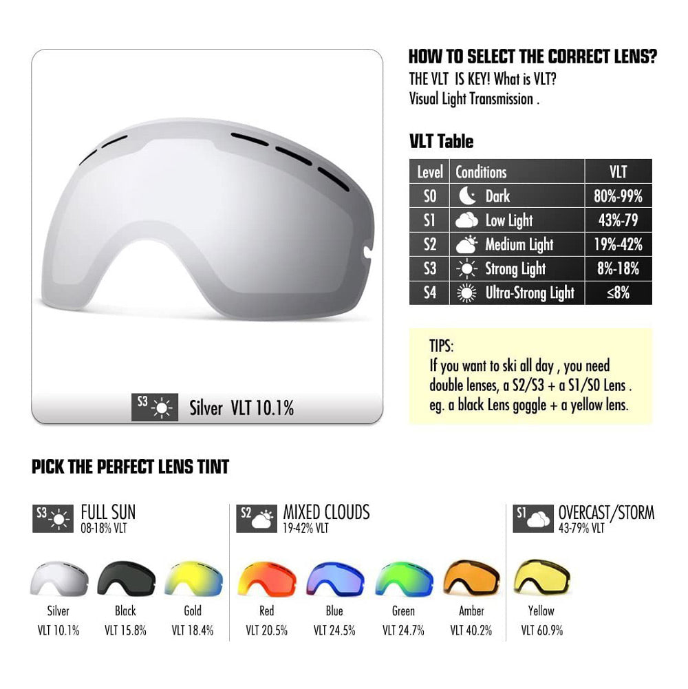 ❤ Interchangeable Lens - There are many different replacement lenses available for G1 Ski Goggles. Perfect ski goggles to make your own combination for different light conditions. If you want to ski from day to night, it's better that you got two lenses to switch, please contact us.